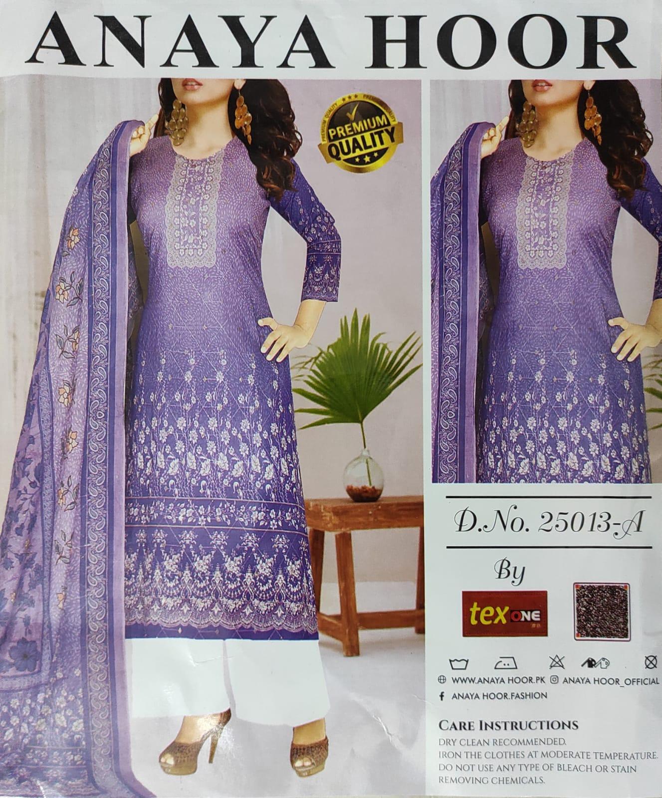 Unstitched Digital printed cotton 3 PieceBrand: Anaya hoor Digital Printed with CarchupiColor: same as picture Dry cleaning recommend